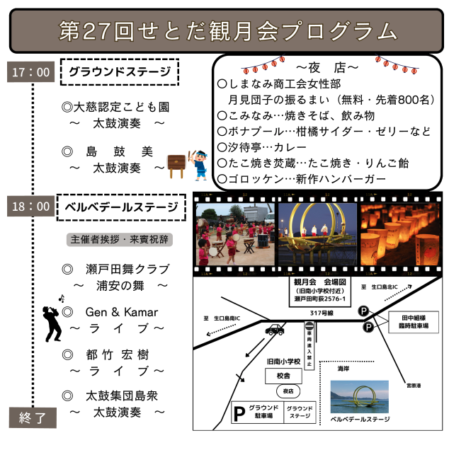 「ベルベデールせとだ」を舞台に力強い太鼓演奏や優雅な舞の披露などが行われます。海岸には地元の子供たちが作成したぼんぼりが並び、夜店の出店やお月見団子のふるまいもあり、秋の夜を楽しめるイベントです。