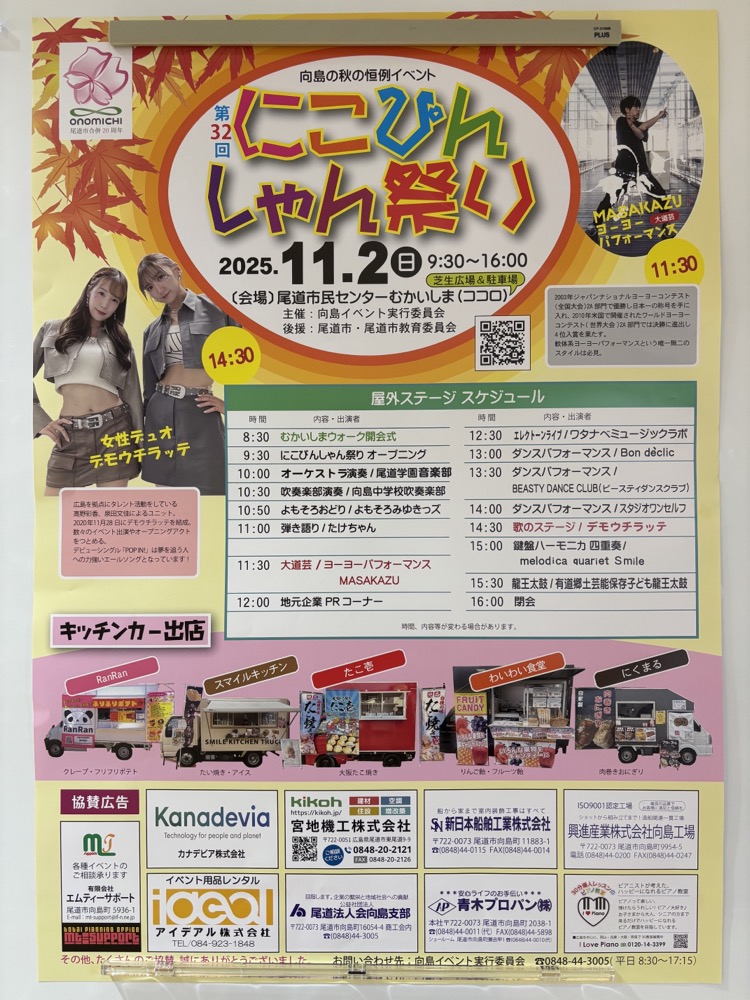 午前は「尾道学園音楽部」や「向島中学校吹奏楽部」の演奏、「よもそろおどり」、たけちゃんの弾き語りなど、地域らしいラインナップが並びます。
