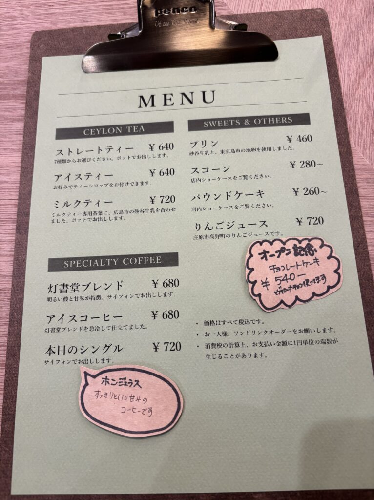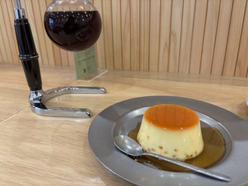 今回は、プリン(460円)と灯書堂ブレンド(680円)を注文しました。プリンは硬めの食感で、ラム酒がほんのり香る大人な味わい。ほろ苦いコーヒーとよく合います。